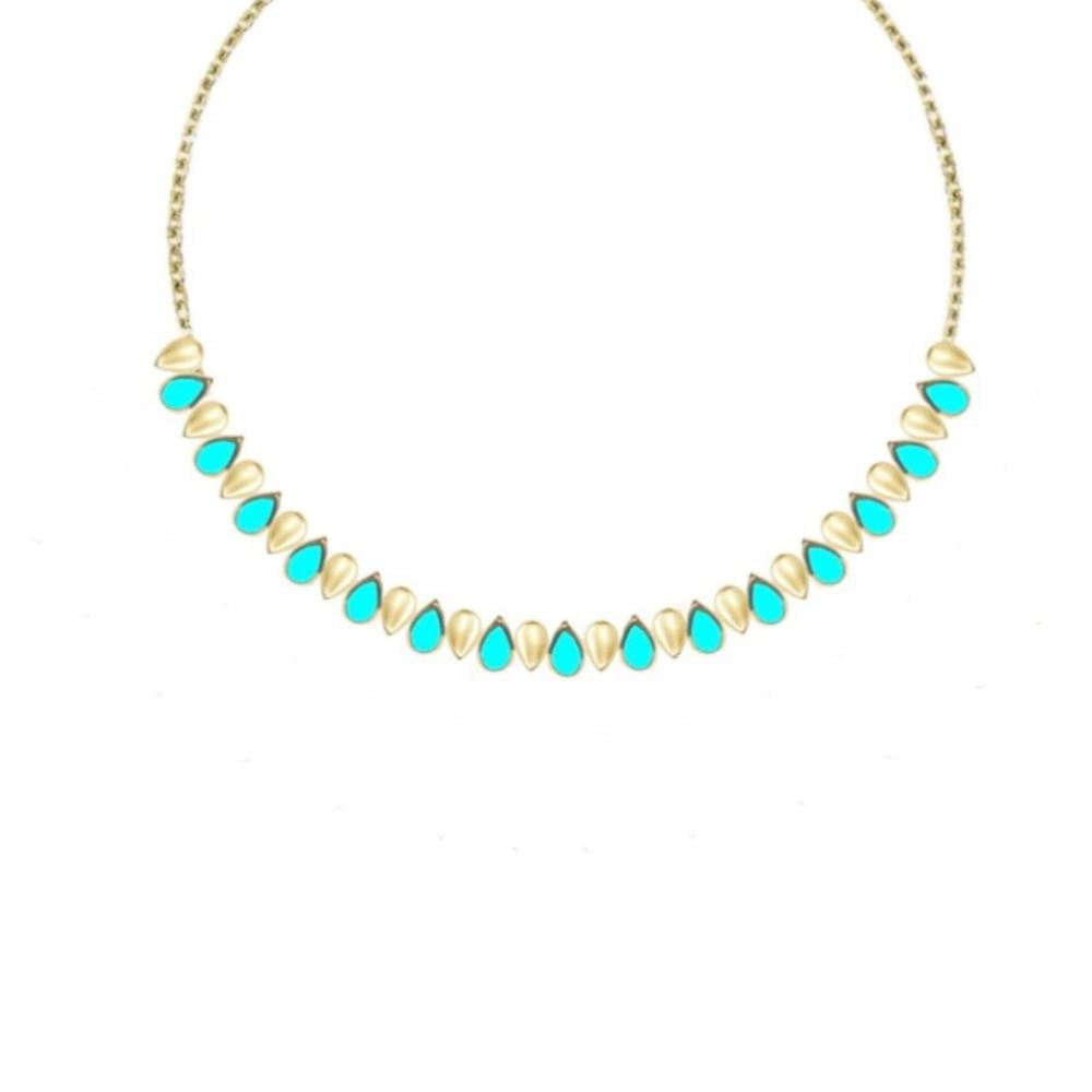 تشوكر ذهب مع مينا أنيق ومميز بتصميمه الجذاب، حيث يجمع بين فخامة الذهب وحرفية المينا يأتي التشوكر مصنوعًا من الذهب الاصفر عيار 18 مما يضمن له متانة عالية ولمعانًا رائعًا. والمينا وهي تقنية فنية تطبق طبقة رقيقة من الألوان الزاهية المعدن، مما يعطي القطعة طابعًا فنيًا وحيويًا.